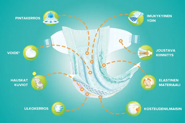 - Pintakerros: siirtää kosteuden vaipan sisään, jotta lapsen iho pysyy kuivana. Lapsen ihoon kosketuksissa oleva pintakerros sisältää polypropeenikuituja, jotka tekevät siitä pehmeän ja miellyttävän tuntuisen.